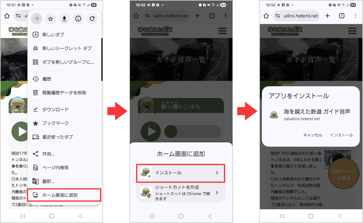 ホーム画面に追加を選択 - 3.画面の手順に沿ってページを